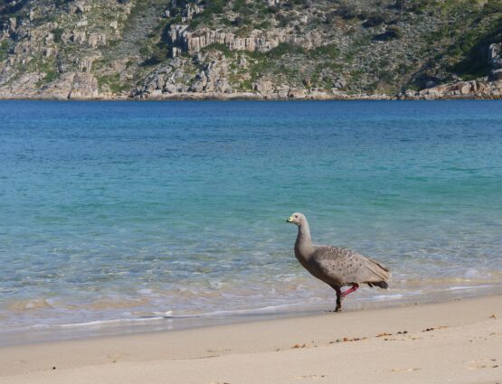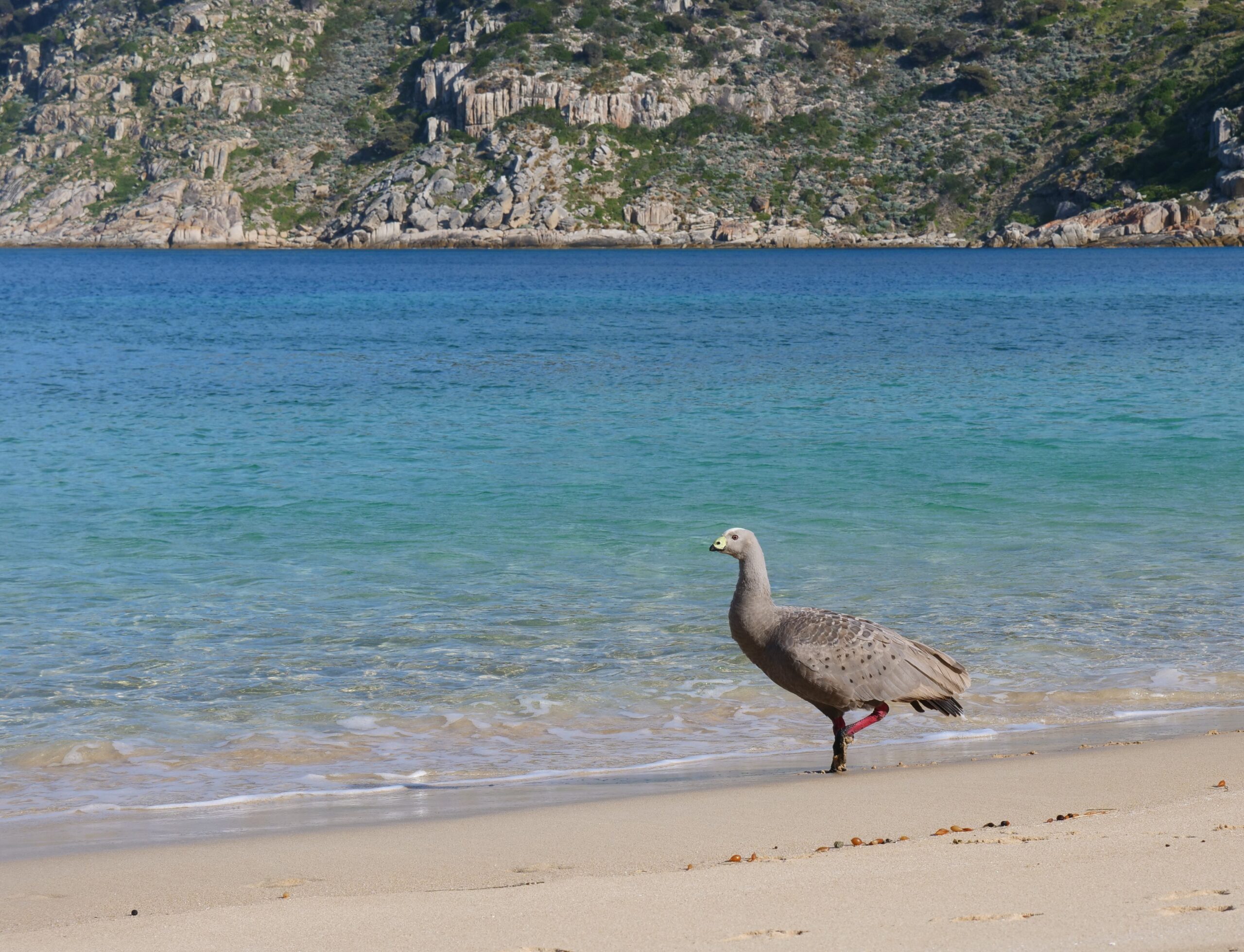 A Cape Barren goose walks freely on Erith Island in Bass Strait.