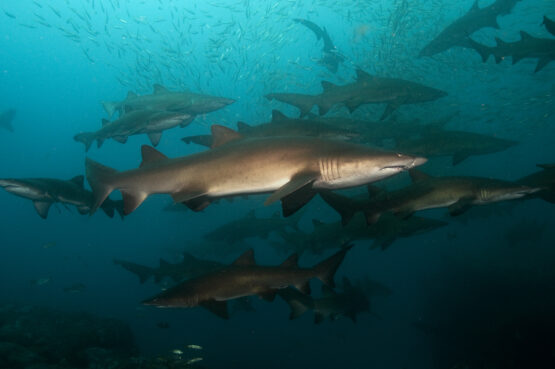 Grey nurse sharks at Big Seal Rock, NSW. The grey nurse shark a priority species in the Australian Government’s Threatened Species Action Plan 2022–2032. Marine and Coastal Hub research has collected new data and updated grey nurse shark population size estimates, improving the evidence base for decisions about their conservation and recovery. Image: David Harasti