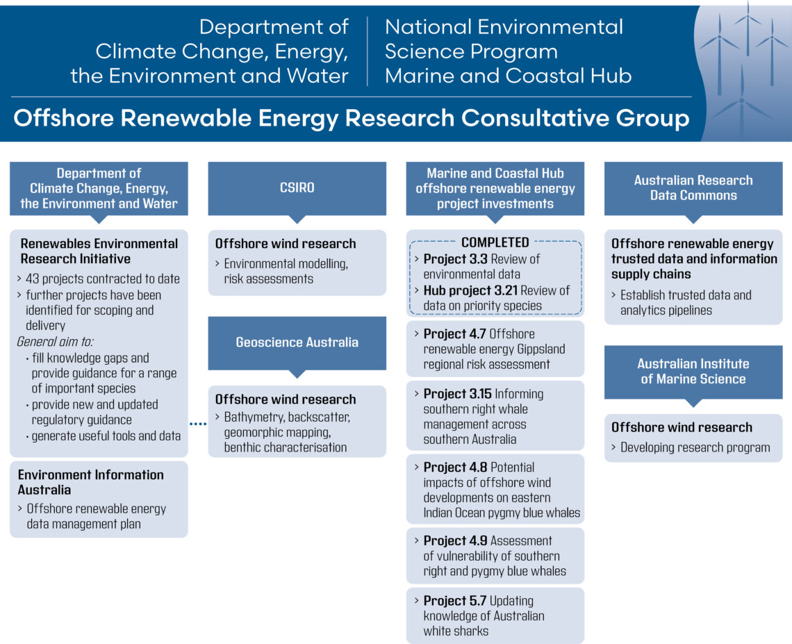 The group is co-managed by the Department of Climate Change, Energy, the Environment and Water and the National Environmental Science Program Marine and Coastal Hub. It provides a consultative mechanism to ensure government environmental research efforts relating to offshore renewable energy are coordinated and relevant areas are engaged in developments. It also provides a forum for sharing project updates, early insight from draft deliverables, engagement outcomes, and developments on cross-cutting issues such as data management and delivery.