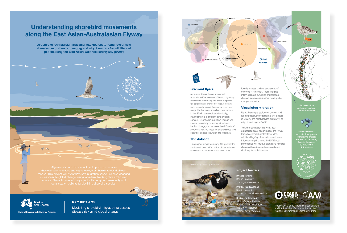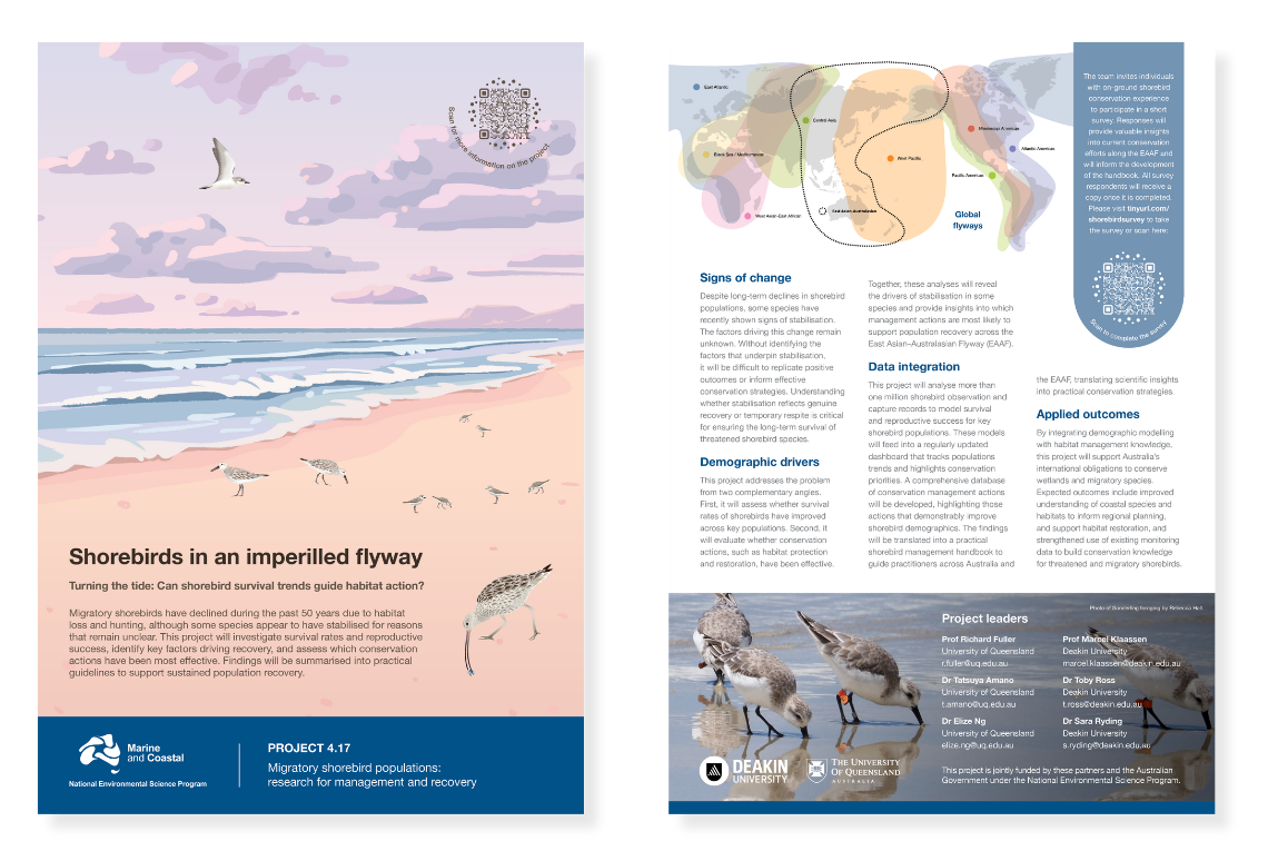 The Marine and Coastal Hub has developed two flyers on Hub-funded shorebird projects for stakeholder and public engagement at international East Asian-Australasian Flyway meetings and ornithological conferences. These visual aids were created to support the work of the following two research projects: