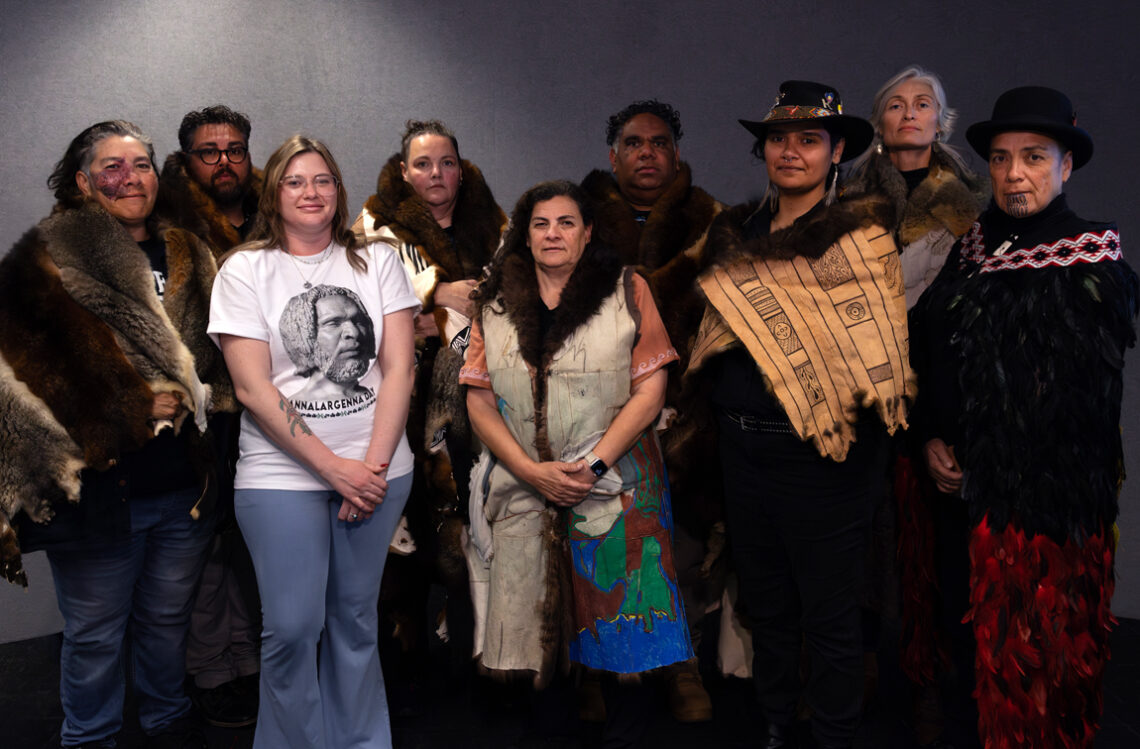Cultural custodians at the Hobart meeting. From left: project co-leader Dr Chels Marshall (Gumbaynggirr) of the University of Wollongong, Assistant Director Cultural Heritage Parks Australia DCCEEW, Clive Freeman (Traditional Owner of Booderee), Marine and Coastal Hub Indigenous Facilitator, Jessica Riley (Trawlwoolway and Pairrebeenne), Assistant Director Office of Joint Management Booderee National Park DCCEEW, Markeeta Freeman (Traditional Owner of Booderee), project co-leader Dr Jodi Edwards (Walbanja) of the University of Wollongong, Director Park Manager Booderee National Park DCCEEW, George Brown (Traditional Owner of Booderee), storyteller Bee Cruse (Biripi, Yuin, Gommeroi, Wiradjuri), project research assistant and cinematographer Natalia Baechtold (Ngarrindjeri) of the University of Wollongong and postdoctoral research fellow Dr Lou Netana Glover (Ngāti Whātua-Ngāpuhi, Walbunja) of the Centre for Critical Indigenous Studies Macquarie University. Image: Natalia Baechtold